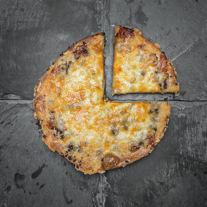 Our light and crisp original crust, 100% real mozzarella cheese, burger sauce, lean ground beef, aged cheddar