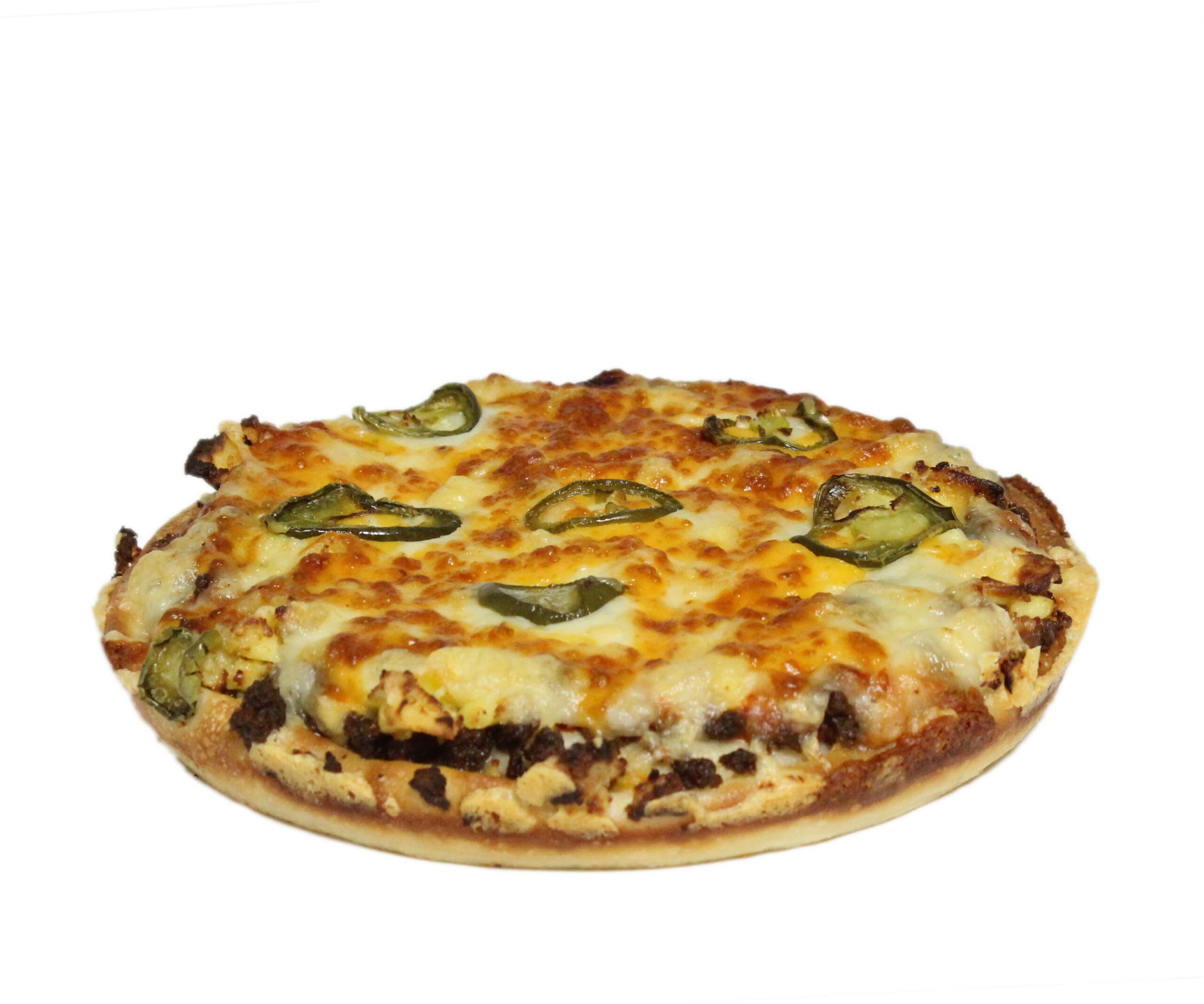Our light and crisp original crust, scrambled eggs, spicy chunky salsa , 100% real mozzarella cheese, aged cheddar, lean ground beef, jalapeno slices