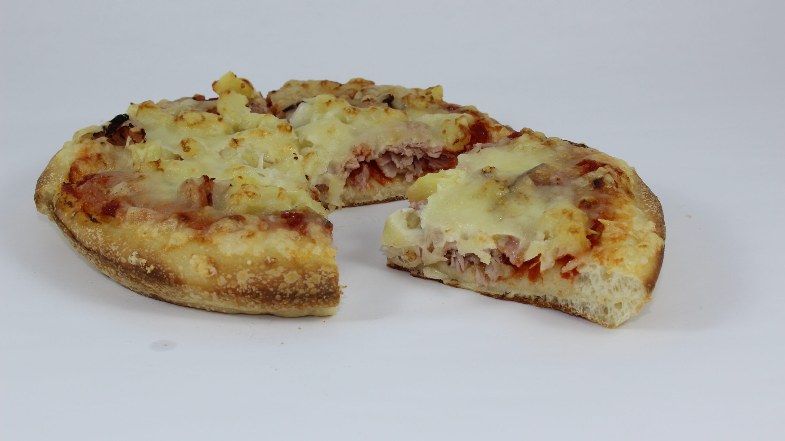 Description: Our light and crisp original crust, 100% real mozzarella cheese, sun ripened tomato sauce, sweet pineapple chunks, black forest ham