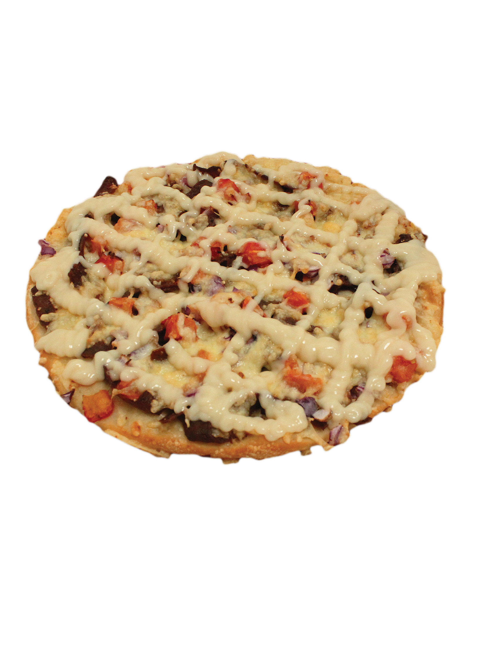 Our light and crisp 10″ original crust, donair beef strips, 100% real mozzarella cheese, diced tomatoes, sweet sauce, red onions, cilantro