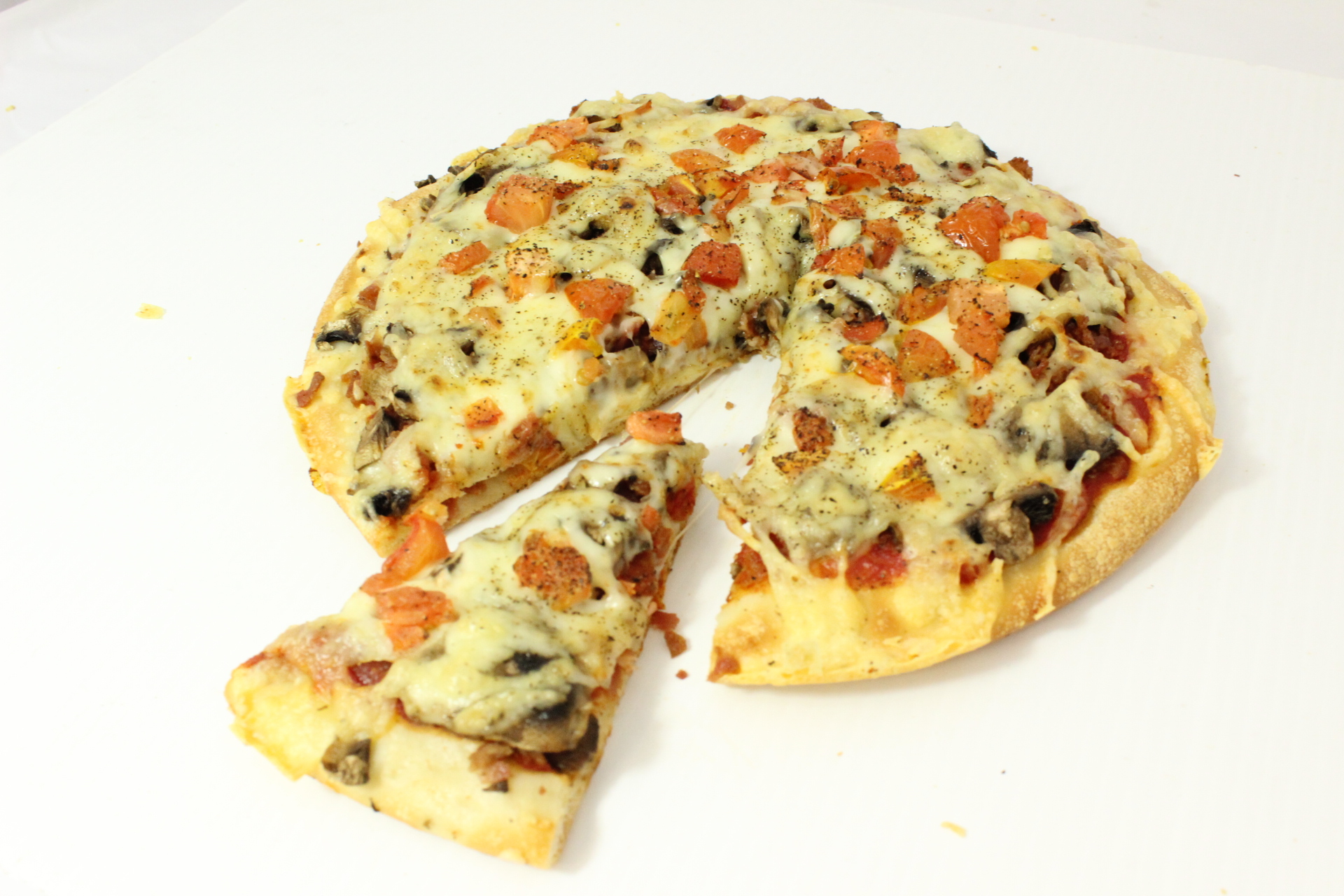 Description: Our light and crisp 10" original crust, 100% real mozzarella cheese, sun ripened tomato sauce, thick cut mushrooms, diced tomatoes, crumbled bacon, black pepper